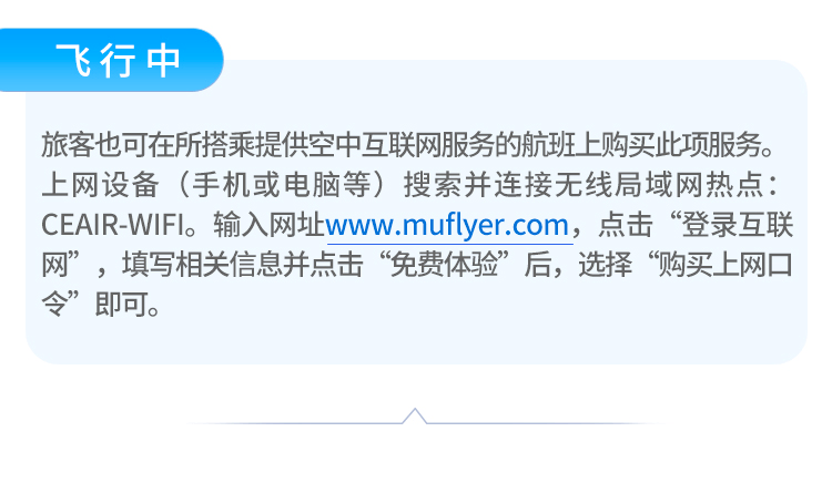 6. 已成功购买的空中互联网服务暂不支持改期。如需变更,可通过东航官网、APP、小程序免费退订后重新购买。